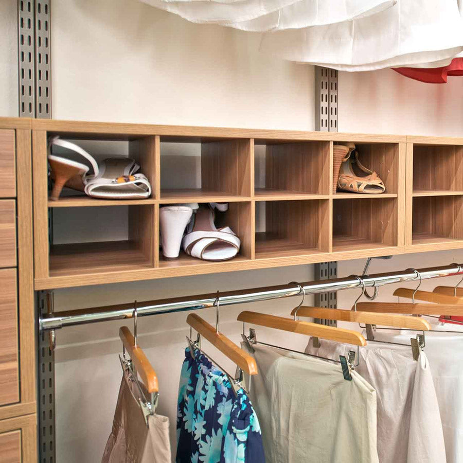 The Double Hang O-Box Cubby Unit in a Cypress Live finish is the versatile cubby system you are looking for to complete your freedomRail closet. This storage system is easily installed; it is supported by freedomRail uprights. You can hang the Double Hang O-Box Cubby Unit at any height. making stacking or eye-level storage an easy possibility. Use it in your closet or even a pantry for food storage - the possibilities are endless.