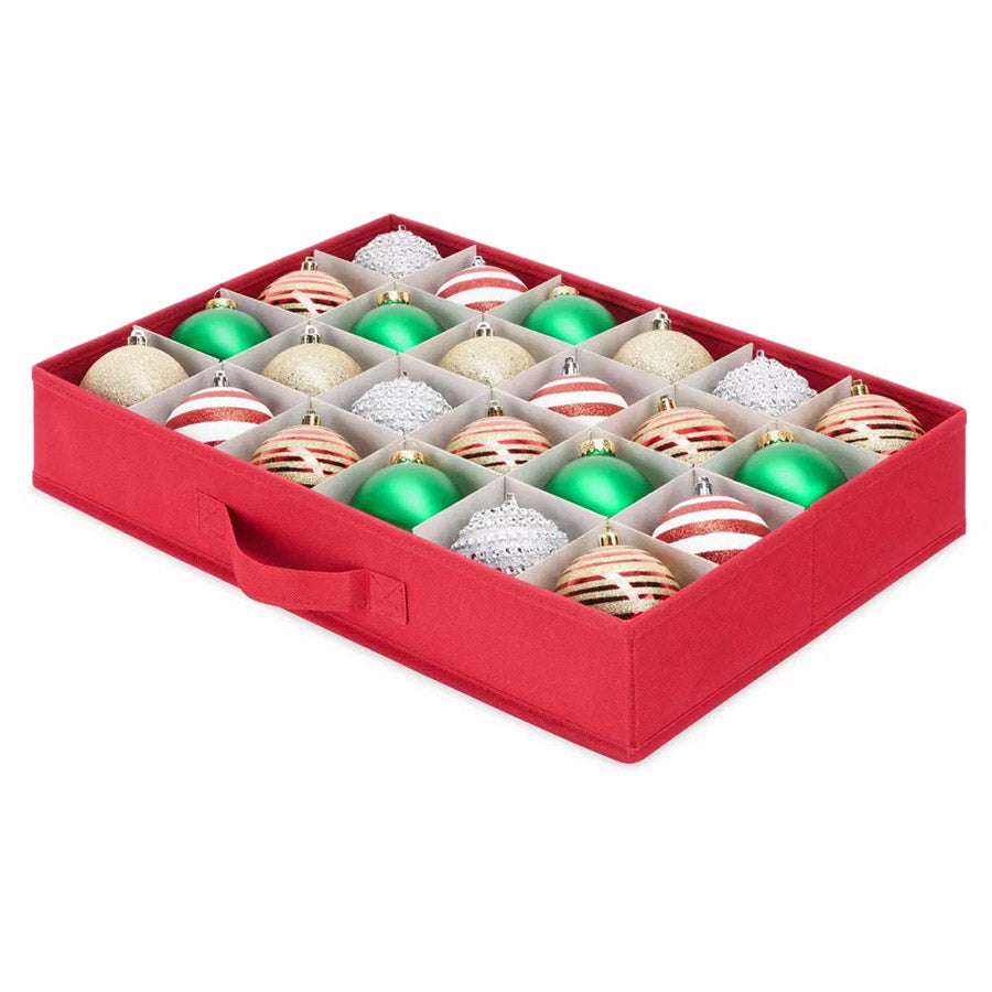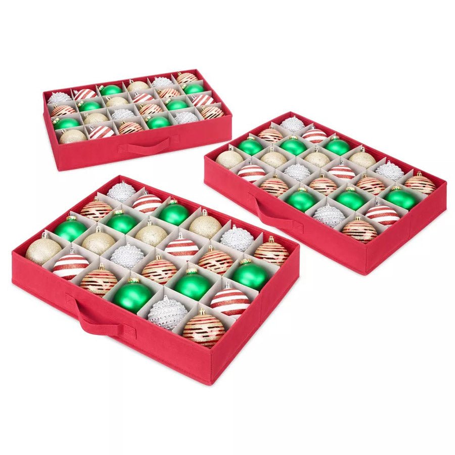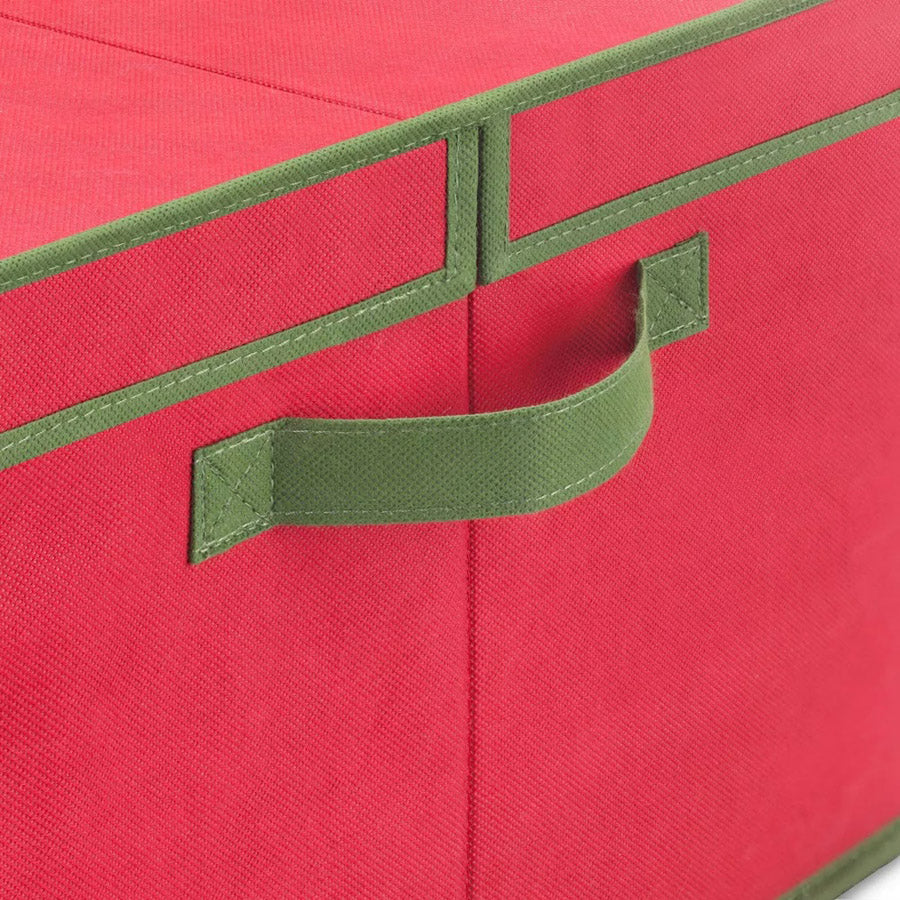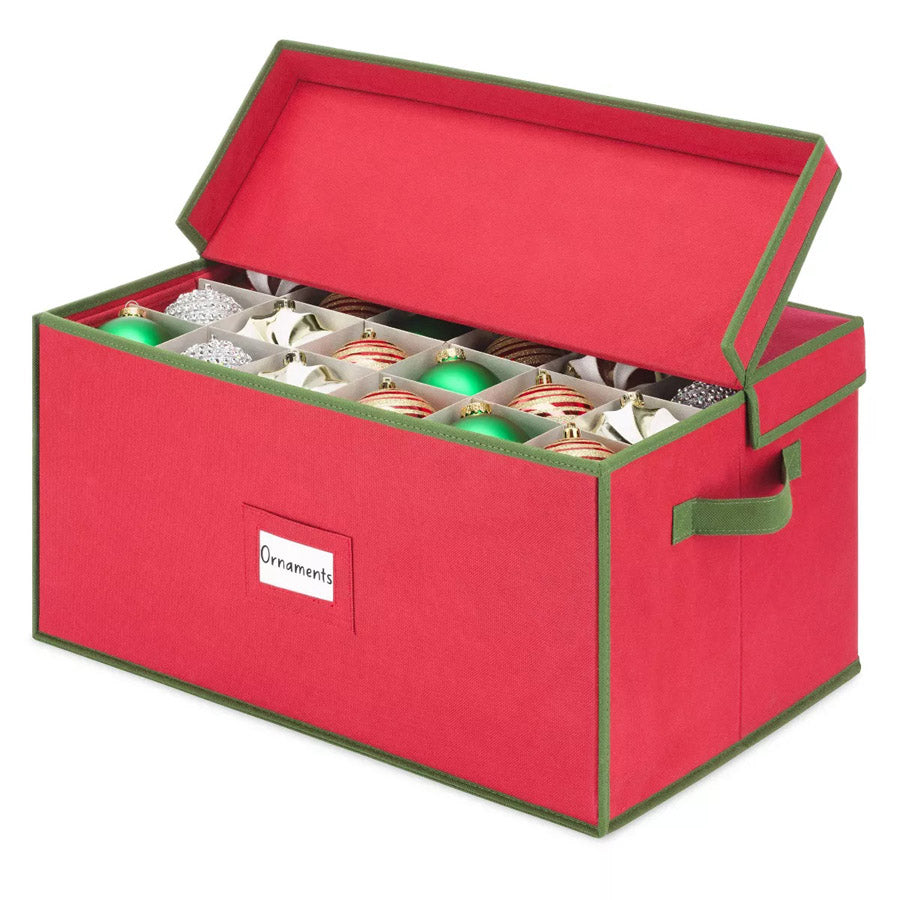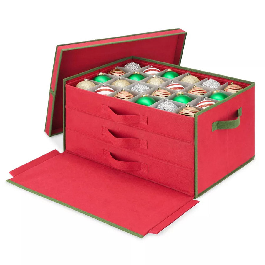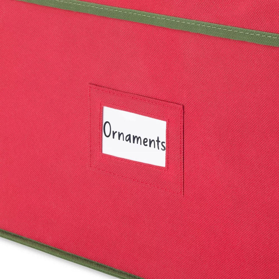 The Large Ornament Box stores up to 72 ornaments in three trays. Each tray has handles for easy transport. The box has a split top for easy access to the ornaments and the front can fold down so you can access each tray. This storage box is a great way to store and protect your holiday ornaments. Each tray has 24 cardboard dividers to hold ornaments. Box has red polypropylene cover with green accents. The box has handles so it is easy to move and a tag holder so you can label contents.