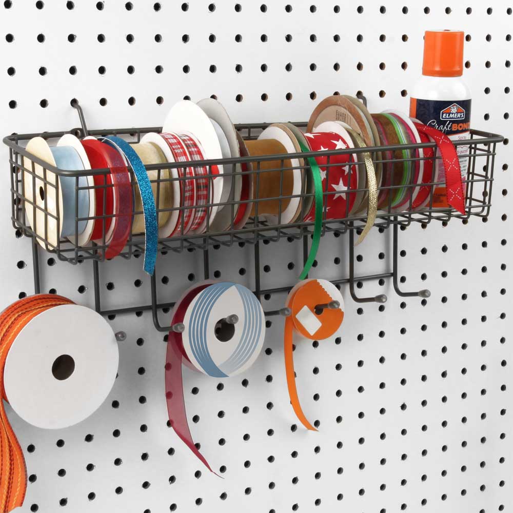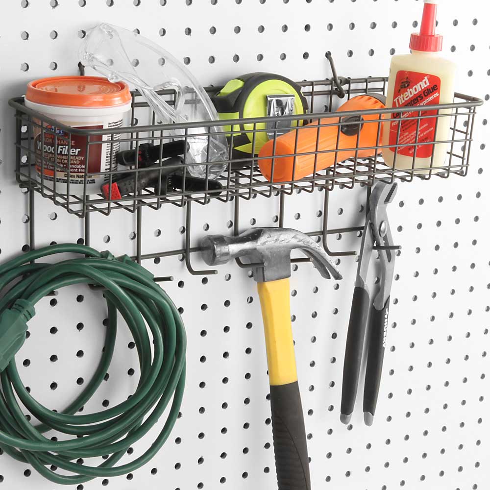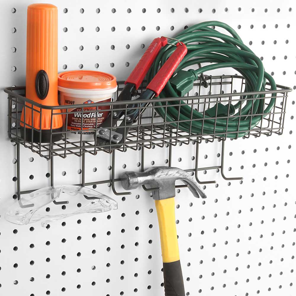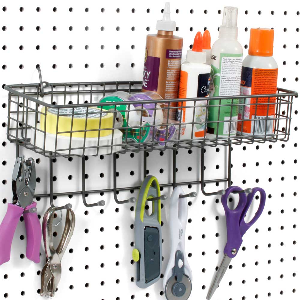 Keep your garage. workshop. or even your craft room neat and tidy with help from the Pegboard Basket and Hook Station. The large wire basket provides plenty of storage space for a wide assortment of supplies. You can store everything from tools to cleaning supplies inside the bin to keep them neatly organized and easily accessible.